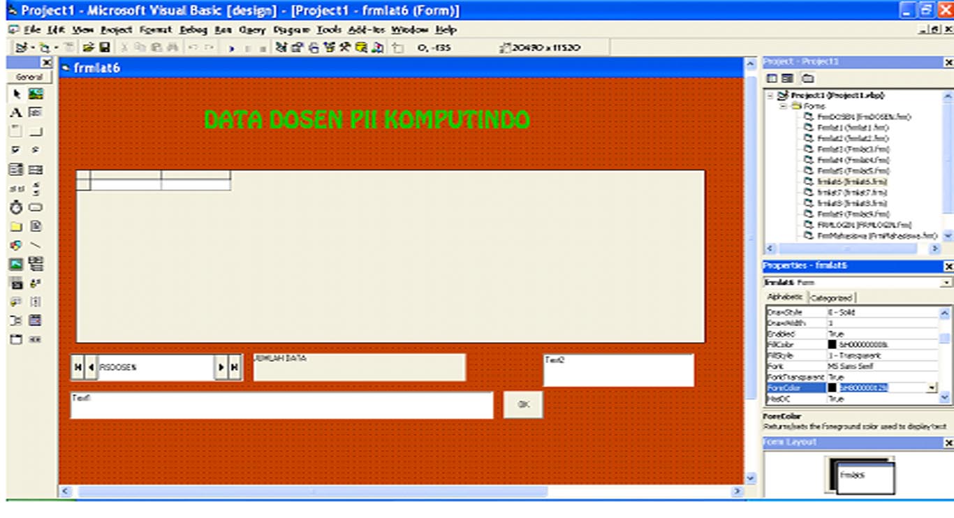 Private Sub Command1_Click()RSDOSEN.Recordset.MoveFirstTAMPILEnd SubPrivate Sub Command2_Click()RSDOSEN.Recordset.MovePreviousIf RSDOSEN.Recordset.BOF Then MsgBox ("ini data awal") RSDOSEN.Recordset.MoveFirstEnd IfTAMPILEnd SubPrivate Sub Command3_Click()RSDOSEN.Recordset.MoveNextIf RSDOSEN.Recordset.EOF ThenMsgBox ("ini data terakhir") RSDOSEN.Recordset.MoveLastEnd IfTAMPILEnd SubPrivate Sub Command4_Click()RSDOSEN.Recordset.MoveLastTAMPILEnd SubPrivate Sub Command5_Click()RSDOSEN.RefreshTAMPILEnd SubPrivate Sub Form_Load()RSDOSEN.RefreshTAMPILEnd SubPrivate Sub TAMPIL()Text1 = RSDOSEN.Recordset.Fields(0)Text2 = RSDOSEN.Recordset.Fields(1)taxt3 = RSDOSEN.Recordset.Fields(2)Text4 = RSDOSEN.Recordset.Fields(3)End Sub